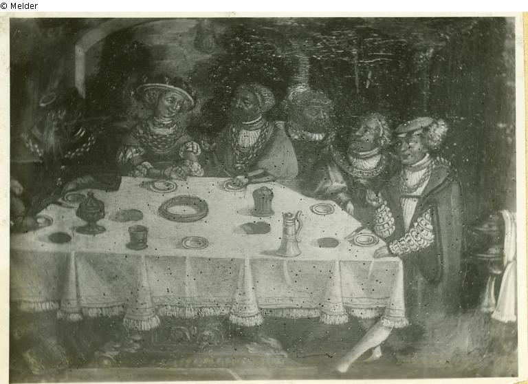 Drei Szenen des Gleichnisses vom reichen Kaufmann und armen Lazarus in einem Bildfeld vor Architekturkulisse. Zentrale Mittelszene zeigt prunkvoll gekleidete Tischgesellschaft des reichen Kaufmannes. In der rechte Bildhälfte der arme Lazarus mit Bettelschale; in der linken Bildhälfte Sterbeszene des reichen Kaufmannes. Schriftzeilen im Bildfeld erläutert die jeweiligen Szenen.