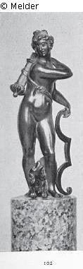 Nackt, stehend; mit der Rechten greift sie nach rückwärts über die Schulter, um aus dem Köcher einen Pfeil zu nehmen. Der mit Pfeilen gefüllte Köcher wird mit einem Bande, das vorn verknüpft ist, gehalten. Mit der Linken hält die Göttin den auf dem Boden aufstehenden Bogen. Zwischen ihren Beinen ein Hund, der zu ihr aufblickt. Das hochgenommene und kunstvoll frisierte Haar ist mit einem Diadem geschmückt.