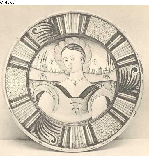 A LARGE DERUTA PORTRAIT DISH with sunk centre, decorated with a full-face bust portrait of a girl in blue and yellow dress with green full short sleeves and a green cap, the head flanked by the initials " F.E. ", a view of a city in the distance, the border with scale ornament, saw edged leaves and vertical stripes in orange, blue, white and yellow, the underside with a brown glaze bearing two C scrolls in blue, 16Ji«., circa 1530