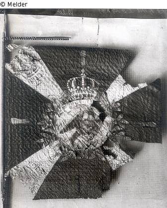 Tuch: Vier schwarze, zwei weiße Keile. Mittelschild mit fliegendem Adler, Devisenband, umgeben von Palmkranz mit Krone. In den Ecken Monogramme mit Krone. Nagelung: 51 Nägel mit weißer Borte.