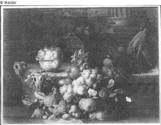 Vor antikisirender Architektur mit einer Kannelierten Säulenbasis rechts oben erhebt auf einem polierten Marmorboden ein an den Ecken mit Widderschädeln geschmücktes Podest (Altar ?); darauf eine Porzelan- beziehungsweise Fayenceschale mit verschiedenen Früchten, ebenfalls vor dem Podest zu einem Haufen aufgetürmt; Signatur: Jean Paulo Gillemans; Maße: 95,3 x 124,5 cm