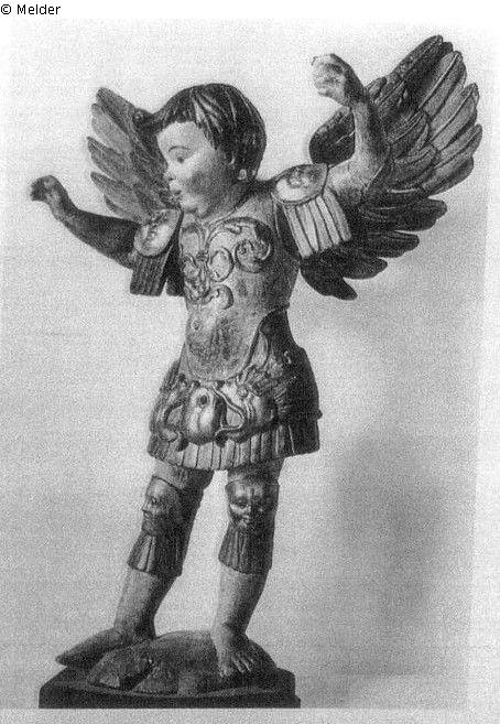 Fassung gut erhalten (Helbing: Putto, geflügelt, in reich ornamentierter Rüstung mit erhobenen Armen. Vollrund mit alter Fassung);