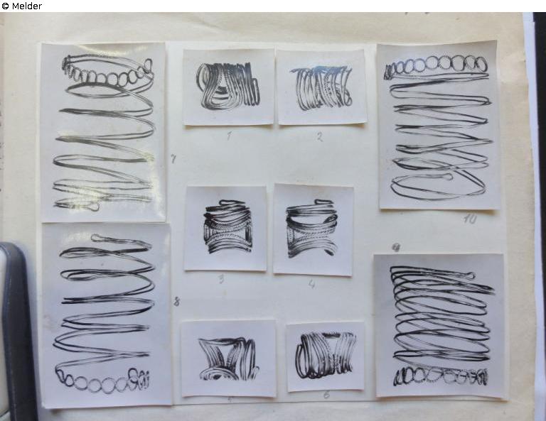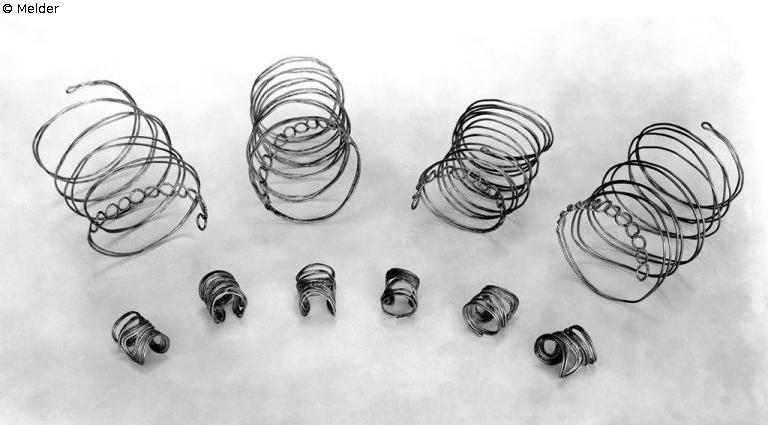 belongs to a find, which consists of: 4 arm rings of wire, taken twice, in 8 windings through turn ("Wendelung/Tordierung") bent to 9 eyelets, on the other hand only a small eyelet; 6 spiral arm rings of round rhomic gold wire, turned to a disc, the last winding formed as a ring. Both arm rings and finger rings are paired, contrary, made; Bronze Age, so-called "Fremdgruppen zeit"; total mass of the find: 297 grams