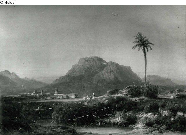 Greek landscape, on the left separate palm tree, on the right view of a city