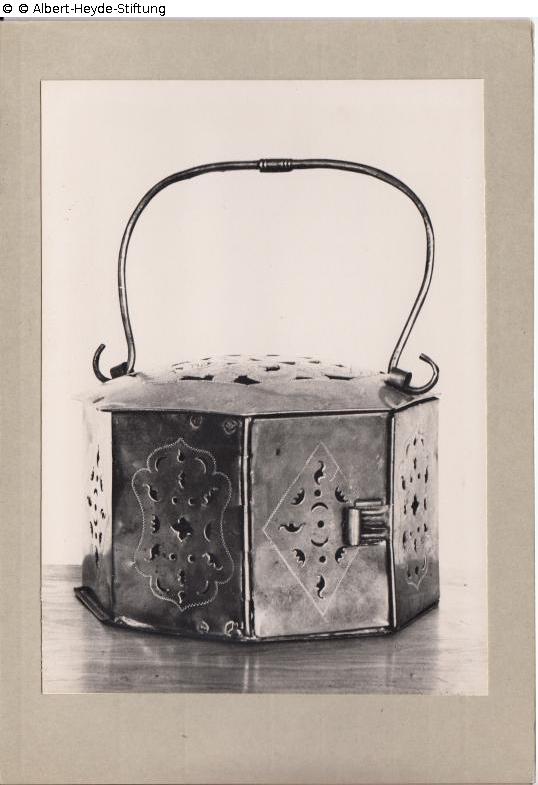 Firebox (“warming box”) made of stamped brass with iron handle. Octagonal shape with convex lid and side flap.