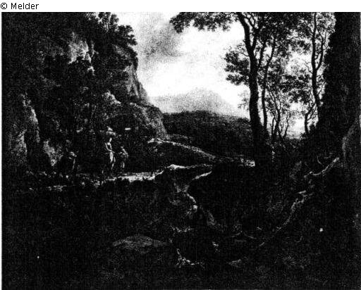 An einem bewaldeten Hügel entlang führt ein Weg, auf dem Bauer und Bäuerin mit zwei Mauleseln ziehen. Rechts hohe Bäume und Bach zwischen Felsen, Sonnenuntergang. - Rechts unten bez.: Both F.; Goldrahmen