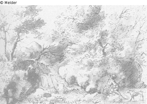 drawn (pen-and-ink drawing) ; washed