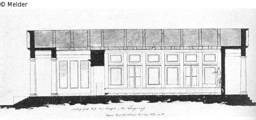 Zum Denkmal Friedrichs des Großen und dessen architektonischer Umgebung: Entwurf eines Tempels; Blatt 3; Sign./Bez.: Durchschnitt durch den Tempel, der Länge nach