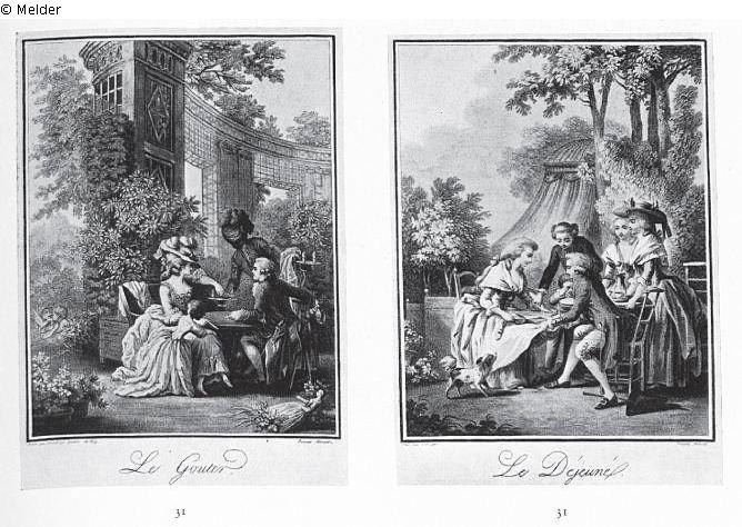 Zwei Blatt Gegenstücke: Elegante Rokokogesellschaften beim Tafeln im Freien. Nach Baudouin und J. B Huet. Paris. Kl.-Folio.