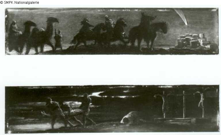 Panel painting: Picture: the dead Christ being carried to the tomb & Golgotha: the cross(es) in the background & landscapes representing or symbolising the night (sometimes named as: Nox).