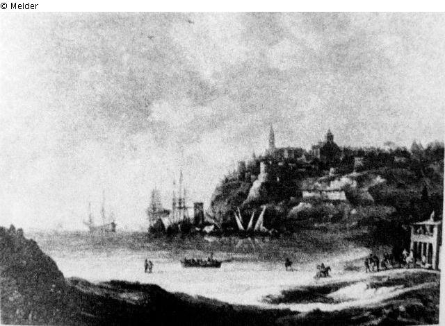 Am Ufer einer sich tief ins Land erstreckenden Meeresbucht erhebt sich auf felsiger, terassierter Höhe eine befestigte Stadt mit Prunkbauten und Kathedralen. Auf der Reede zahlreiche Schiffe, im Vordergund vor einer Schenke eine Reitergesellschaft.