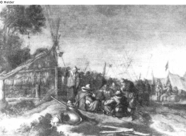 In the centre is a group of soldiers, playing cards or watching the game. To the left is a hay shelter. To the right is a tent with soldiers in front of it.
