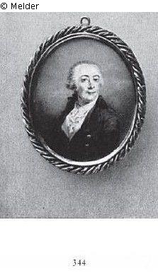 Höhenangabe mit Rahmen. Auf Elfenbein, oval. Hüftbild; der Kopf leicht nach links gewendet. Bartloses Gesicht mit kräftiger Nase und dunklen Augen; das Haar gepudert und leicht gelockt. Brauner Rock mit Goldknöpfen, gelbliche Weste und weißes Jabot. Der Hintergrund blaugrau gewölkt. Die Fassung Bronze vergoldet; an den schmalen Rahmen ein doppelt gedrehtes Tanzband gelegt. Beschreibung Lange: Hüftbild, oval, auf Elfenbein. Der Kopf ist leicht nach links gewendet. Bartloses Gesicht mit dunklen Augen. Das Haar gepudert und leicht gelockt. Brauner Rock mit Goldknöpfen. Der Hintergrund blau-grau gewölkt. Fassung Bronze, vergoldet.