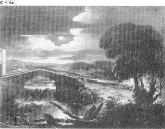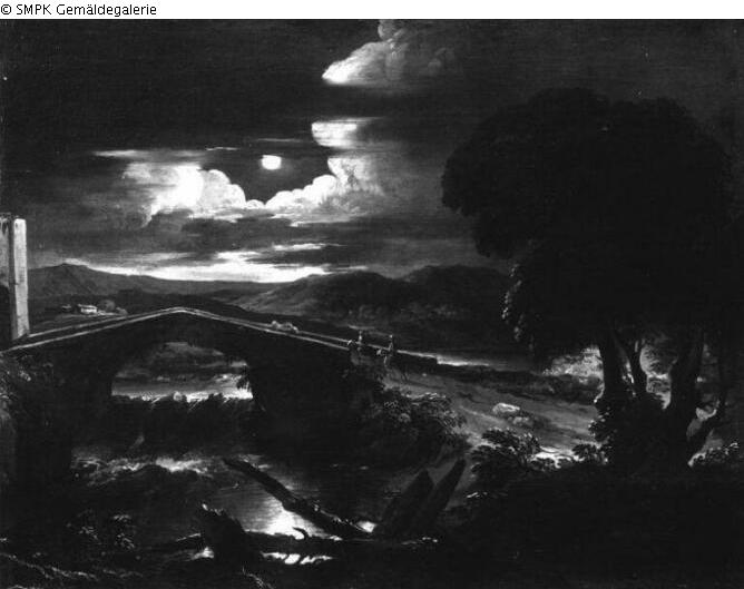 Panel painting: Depiction: Hillscape & landscape with a bridge, viaduct or aqueduct & stream & moonlight; hills; rolling hills & bridge; viaduct; aqueduct & stream & moonlight; light