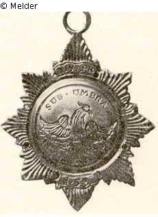 Ein Stern aus weißem Metall, der auf der einen Seite ein gekröntes und mit Trophäen umgebenes Schild mit dem Monogramm Friedrichs des Großen und der Umschrift: "TERROR HOSTIUM", auf der anderen einen Adler mit der Umschrift: "SUB . UMBRA . ALARUM . TUARUM