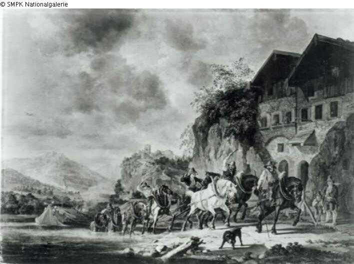 Panel painting: Picture: Horse & riding on a horse, donkey, mule, etc.; rider (in) & dog & river & mountains & living in the country, e.g. country house, villa, cottage & castle, chateau