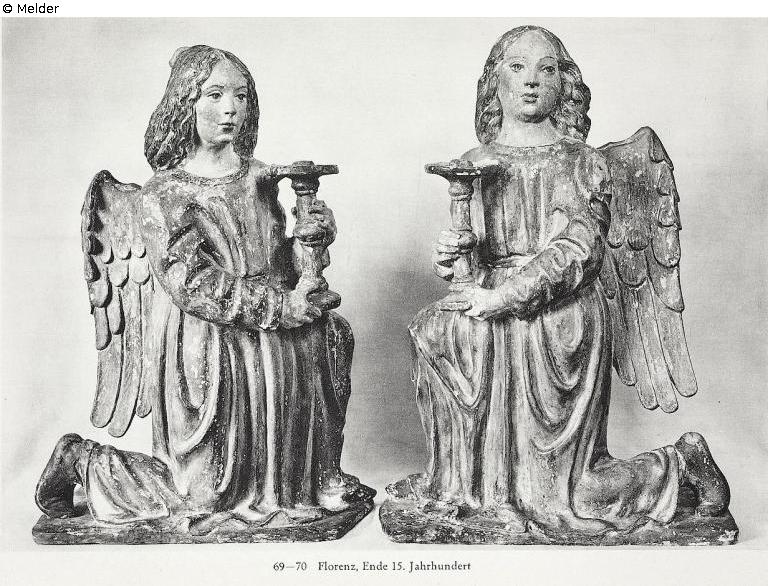 At shallow pedastals to the left and right two angels are kneeling in crinkled, girt garmlets, turned a bit to the front. Long hair. In their hands the candlesticks. At shoulders hugh wings. Terracotta, full-round. Old painting. Source: Hugo Helbing Kunsthandlung and Kunstversteigerungshaus: Kunstbesitz eines Berliner Sammlers. Katalog Nr. 49.