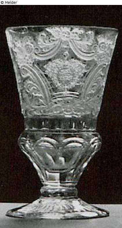 With short stem, wheel-engraved. At bowl plenty decorated baroque cartouche with emblem and collar of order of the Black Eagle as well as an ornament of strapwork and acanthus. At lower part shiny arcs and facets. Chipped at rim. Silesia, end of 17th century, probably by Fr. Winter in Petersdorf. Literature: Auktionskatalog Hans W. Lange, Wertvolles Kunstgewerbe, Berlin, 19.-21. Mai 1941, S. 66. Nr. 284, Taf. 40 (DOI: external link)