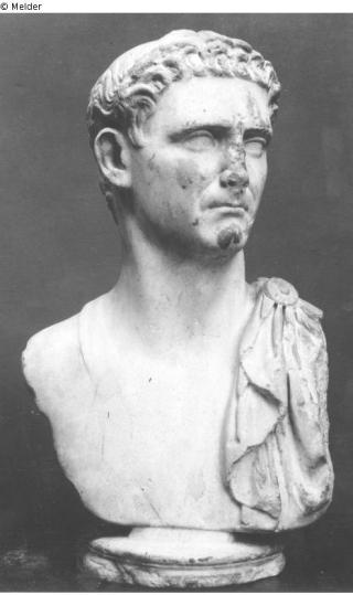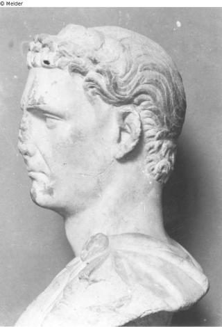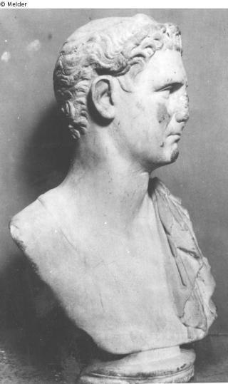 Round sculptured portrait bust of the Emperor Nerva; life-size; beardless; short, neck-length hair; crescent curls; head turned to the left, cloak on the left shoulder; No additions; nose, parts of the left ear and parts of the cloak lost; reworking of a bust of Domitian (?)