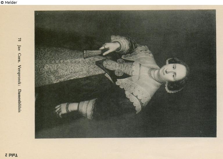 Knee-length portrait. The woman, depicted standing in period costume, holds a fan in her right hand. Signed, S.R.