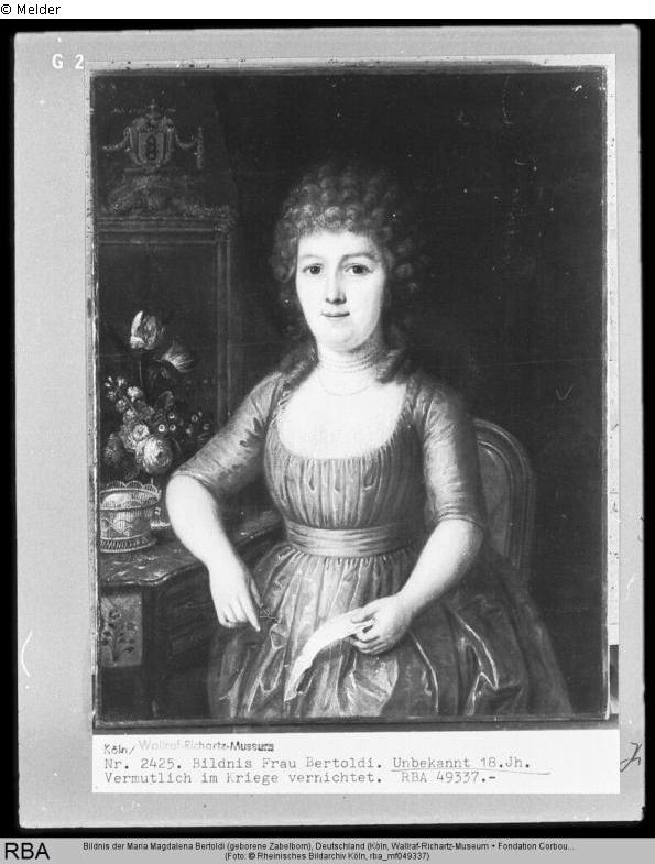 Search Request | Object report Portrait of Ms. Bertoldi, née Zabelhorn Lost Art-ID585374 Previous Next Artist / Creator Unknown TitlePortrait of Ms. Bertoldi, née Zabelhorn Dating1800Object typePaintingGroup of reported objectsPaintingMaterial / TechniqueCanvas / paintedMeasures58,5 x 47 cm Inventory numberWRM 2425Provenance From 1934 Wallraf-Richartz-Museum, Cologne. At the latest in 1934 on loan to Rheinisches Museum, Cologne-Deutz. 1944 High school in Cologne-Mülheim. Since 1945 whereabouts unknown (presumably burned). Read more Read less Published since30.01.2020 Contact Wallraf-Richartz-Museum & Fondation Corboud Obermarspforten 50667 Köln Germany Phone+49(0)221/221-22372Fax+49(0)221/221-22629Homepagehttp://www.wallraf.museum Contact Dezernat für Kunst und Kultur der Stadt KölnPositionMuseumsreferat, ProvenienzforschungPhone+49(0)221/221-22520E-Mailprovenienzforschung@stadt-koeln.de