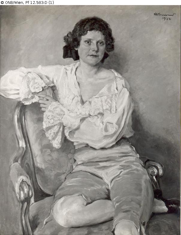 Portrait of the singer Margit Angerer (aka Margit Schenker-Angerer) in the role of Octavian from the opera Der Rosenkavalier. Signed "HBouvard" and dated "1932" top right.