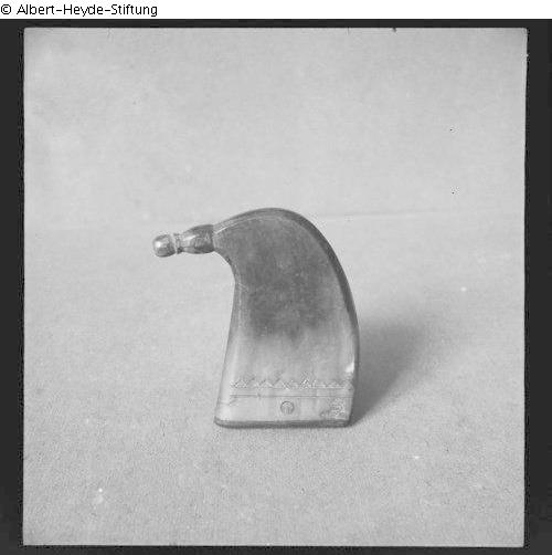 Powder horn with an almost right-angled bent neck. The base set separately. The bottom is parallel to a track with a standing row of prongs. Powder flask for hunting.