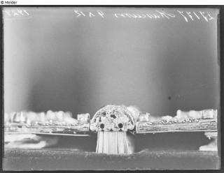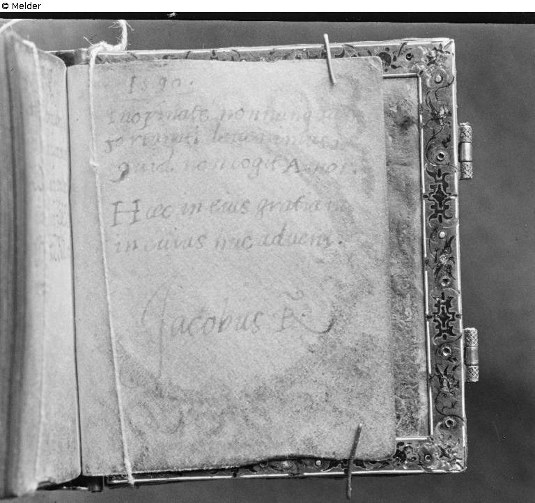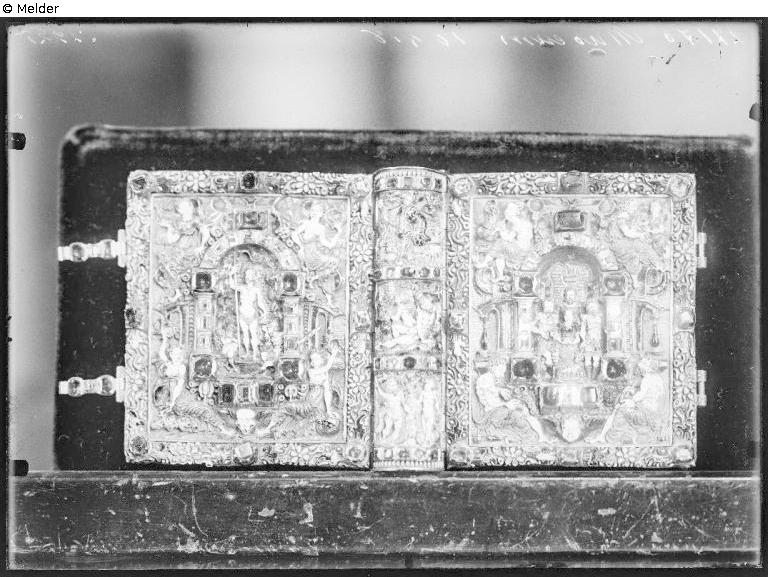 Gold-plated breviary cover. The outer edges with eight emeralds and rubies as well as enamel flowers in high relief, the inner edges with fine flat enamel ornaments; enamel in high relief on the front: Adoration of the Shepherds, on the back: the Resurrection, both beneath an arch set with fourteen diamonds, four rubies and three emeralds; the four Evangelists with their symbols and an angel's head in the four front corners, the four Virtues with wreaths and a skull on the four back corners; on the spine: the Creation, the creation of Eve and the Fall, all enamelled in high relief; flatly enamelled on the crescent shape at the top of the spine: probably David and Goliath. Contains thirteen miniature paintings of scenes from the life of Jesus. The following persons inscribed their names on the first and last pages: Elector August of Saxony and his wife Anna 1579, Duke Ulrich of Mecklenburg and his wife Elisabeth 1579; King James I of England 1590; King Christian IV of Denmark 1623 and Duchess Dorothea Sophia of Mecklenburg-Schwerin 1751.