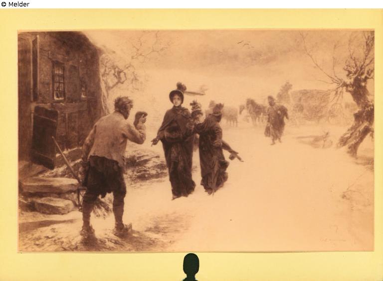 Panel painting: Picture: Winter landscape; landscape denoting winter (in the division of the year into four seasons) & farm or secluded house in a landscape & old man & lantern & four-wheeled cart drawn by animals; e.g.: carriage & luggage