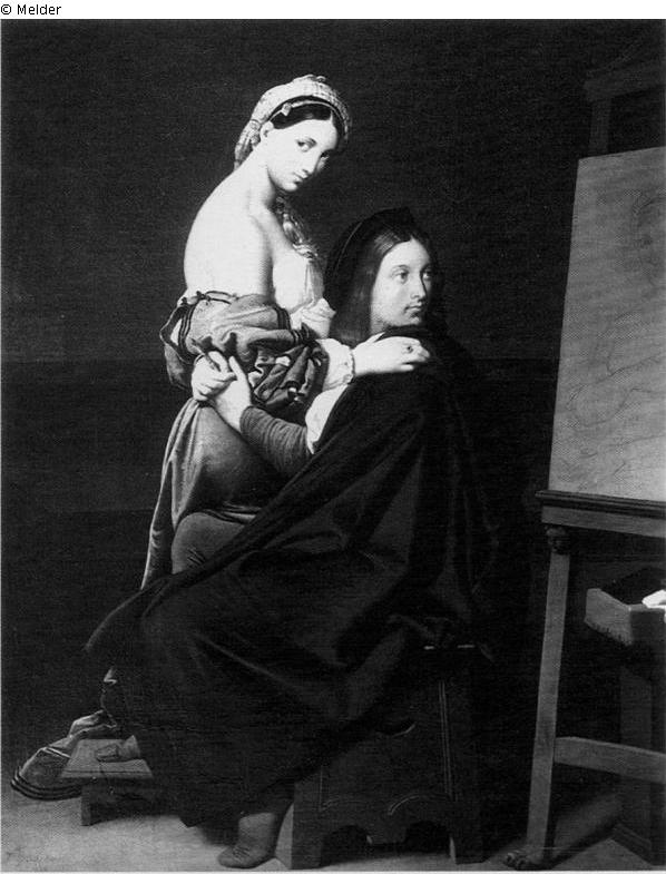 The artist embraces Fornarina standing in front of him with both arms and turns his head back to the easel behind him, on which we see the panel with the arrangement of the famous portrait in the Tribuna of the Uffizi in Florence. Dark background. Inscribed, lower left: Ingres rome 1813