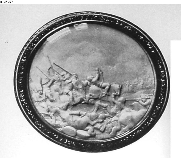 Runde Goldemaildose, mit Brillanten, Elfenbeinrelief und Miniatur, Louis XVI. Hellblau emailliert, mit Kriegsemblemen und Reiterkampf. Im Deckel rundes Elfenbeinrelief, eine Schlacht des Siebenjährigen Krieges dargestellt, von Brillantenring eingefaßt, im Innern Miniatur eines Prinzen. Paris. Mit Pariser Stempeln. Kleine Reparaturstellen an der Wandung. Im alten Lederetui.
