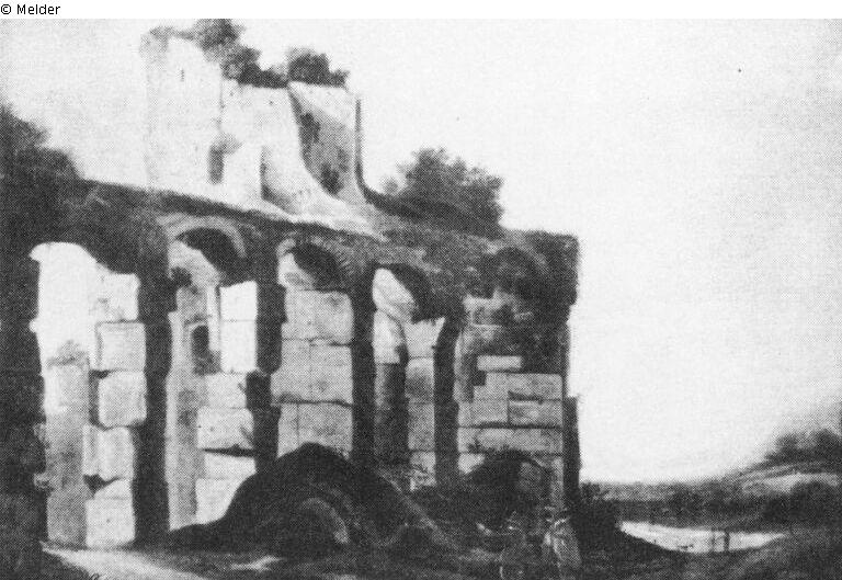 Ruins of an arcade, overgrown with bushes, in a river landscape. Near the ruins are two men.