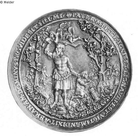 Medaille. Vs.: Abraham, mit einem Muskelpanzer bekleidet, ergreift den Kopf seines rechts neben ihm knienden Sohnes. Mit der Rechten hat er das Krummschwert zum Schlag erhoben, das ein heranschwebender Engel festhält. Links sieht man den Widder und rechts neben dem Altar mit der Jahreszahl 1537 Holzbündel und Opferschale. Hinter Bäumen erkennt man im Hintergrund links Abraham und Isaak auf dem Opfergang und rechts einen Hirten mit Schafherde. Umschrift: + PATER MI ECCE IGNIS ET LIGNA VBI EST VICTIMANDIXIT ABRANAM DOMINVS PROVIDEBIT FILI MI Laubwerk und Gräser sind nachträglich aufgelötet worden. Rs.: Kreuzigung Christi. Oben im Feld die Buchstaben I PE Z Umschrift: PECCATA NOSTRA IPSE PERTVLIT IN CORPORE SVO SVPER LIGNVM VT PECCATIS MORTVI IVSTICIE VIVAM Das Stück geht auf dieselbe grafische Vorlage zurück wie eine geprägte Joachimsthaler Medaille von 1531 mit den gleichen Szenen, oder diese selbst diente als Vorbild.