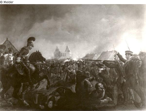 Moment der Schlacht bei Groß-Beeren. Die pommersche Landwehr dringt eben im Sturmschritt in das Dorf, feindliche Truppe aller Gattungen suchen sich durch zuschlagen; der hartnäckigste Widerstand wird noch an den Mauern der alten, im siebenjährigen Kriege zerstörten Kirche geleistet