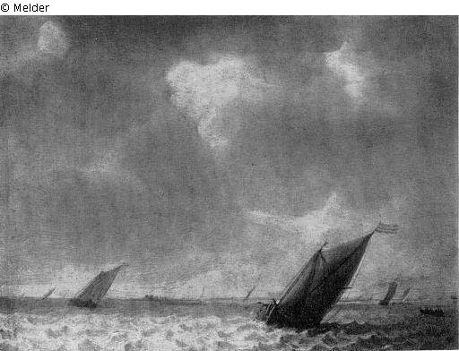 Marine, bewegte See, darauf schräg gestelltes Segelboot und zahlreiche andere Segler, re. ein Ruderboot, li.u. monogrammiert und dat.: 1638