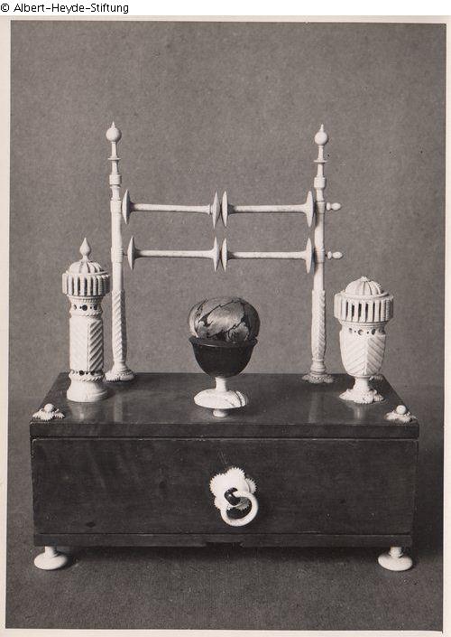 A birch veneer box with a drawer for sewing utensils. On it, a thread winch with two axles for four bobbins, two thread jars and a pincushion, all made of turned bone. Needles, thimble and scissors were stored in the drawer.