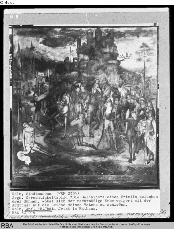 The picture shows a group of people in a landscape. In the background is a city with church as well as a castle on a hill to be recognized. The so-called justice image shows the story of a judgment between three sons. The legitimate heritage refuses to shoot with arrow and bow on the body of his dead father.