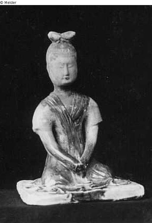 Frau, sitzend, rötlich-weißer Ton, teilweise glasiert in Gelb, Grün und Braun; Imitation Tang-Periode (8. Jh.)