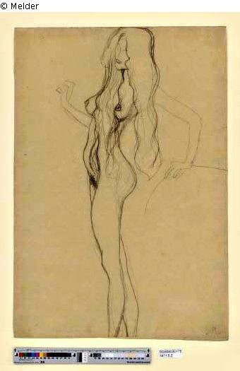 according to Strobl's catalogue of works, no. 773: Standing female nude to the left; black chalk, 451 : 315; signed right below: "Gustav Klimt" and inscribed: "R"; Beethovenfries 1902 (Novotny-Dobai no. 127)