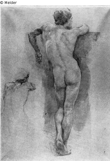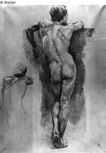 An eine Mauer gelehnt, links kleinere Wiederholung des Oberkörpers. Signatur: Rechts oben: Dez. 92/O. Greiner. Hellbraunes Papier.