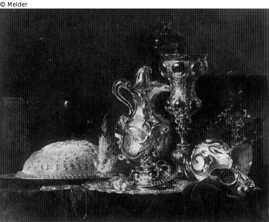 Panel painting: depiction: set table as still life & cup; table; still life & goblet
