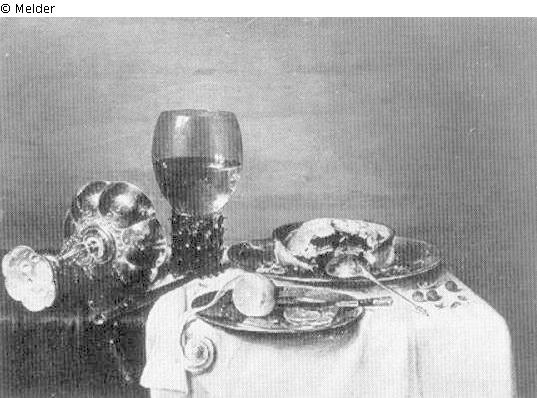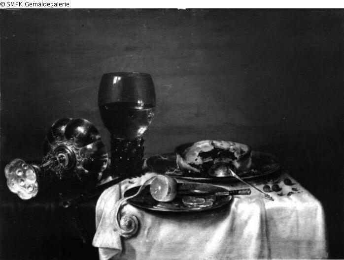 Panel painting: depiction: set table as still life & wine glass, rummer; table; still life & glass; Roman (goblet); signature: on the knife blade: . HEDA . 1631; Dimensions: 55 x 75 cm