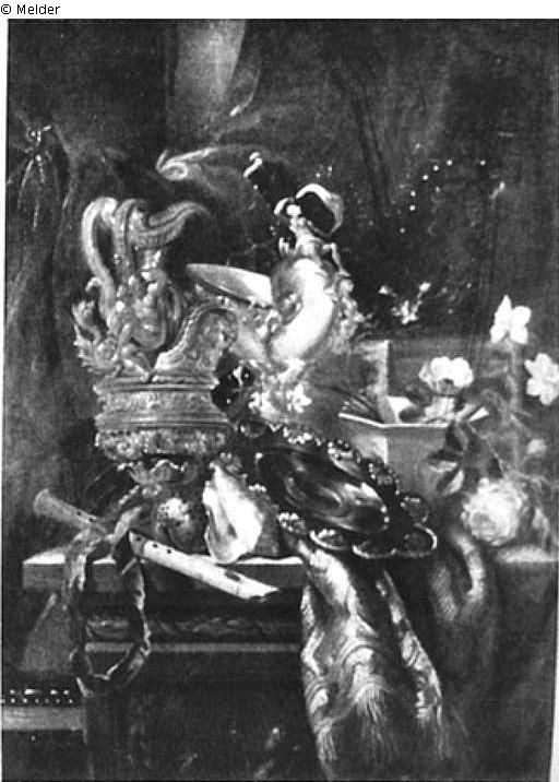 Auf reliefiertem Sockel bunte Decke, Muschel- und Renaissance-Prunkvase, Flöte, Blumenschale und Blumen in buntem Durcheinander von Braun, Rot, Blau und Grau. Goldrahmen.
