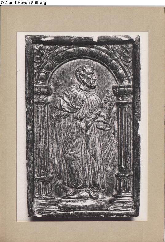 A tall rectangular oven tile with an arcade, in it the Apostle Peter with his key. The tile is said to have been taken from a Jüterbog wine press house and was glazed green.