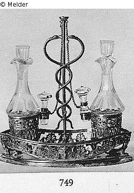 Für Öl- und Essigflasche in Form eines Schiffes. In der Mitte Säule mit Schlange. Beschau: Augsburg. Meister: Karl Ferdinand Tautenhahn (R³ 1030). Gewicht 270 gr.