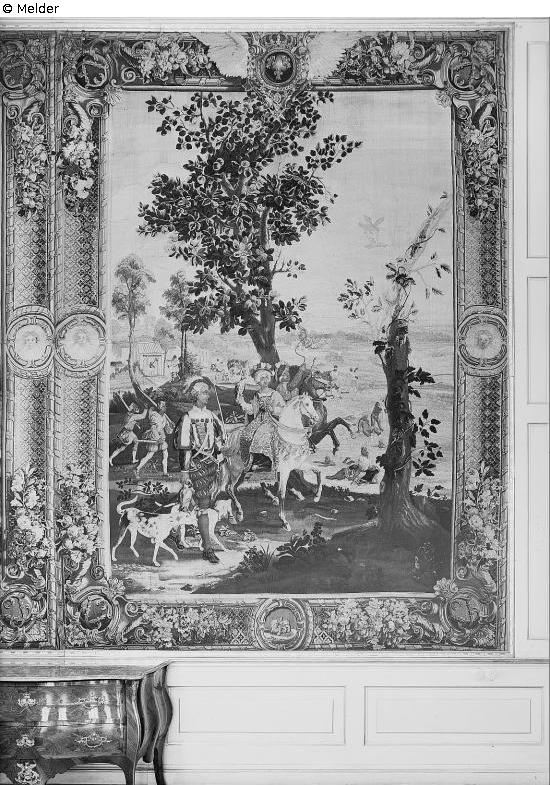 A woman and a man are riding under a fruit-bearing tree. A buzzard sits on her gloved right hand, to the left is a man on foot, he holds a dead white bird in his right hand and a stick in his left. At his left side hangs a sword in a scabbard, and he is accompanied by two white dogs, Behind them are two men, both with long sticks over their shoulders. One of them carries a sword on his right side. In the sky at the top right, a pale grey falcon swoops down on its prey. On the right edge of the picture, behind a tree stump, a pond with young boys bathing on its banks. In the distance, farm labourers are scything the grass, a cart loaded with hay. The distant landscape shows buildings, trees and flat hills. The cartouche within the lower border contains the zodiac sign of Leo.