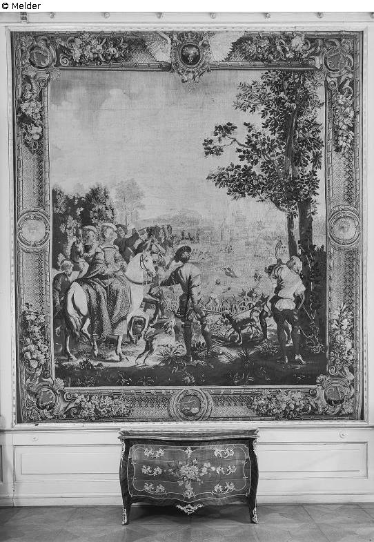 Until 1942 in Dresden Castle, Imperial Salon (Tapestry Hall), Bärengarten wing 2nd floor; in mid-1942 the tapestries (23 in total, including the tapestry named here) were stretched on 8 rolls in the and thus transported to the vaulted first floor rooms of the Dresden Castle; In September/October 1942, the rolls were moved to the Green Vault (Fireplace, Jewel and Bronze Rooms); on August 16/17, 1943, the 8 tapestry rolls were transported to Schleinitz Palace, as an inspection on June 8, 1943 led to the conclusion that the rooms in the Green Vault were not sufficiently protected against bombing; A loss in connection with the events of WWII cannot be ruled out (according to the files, loss at the relocation site).