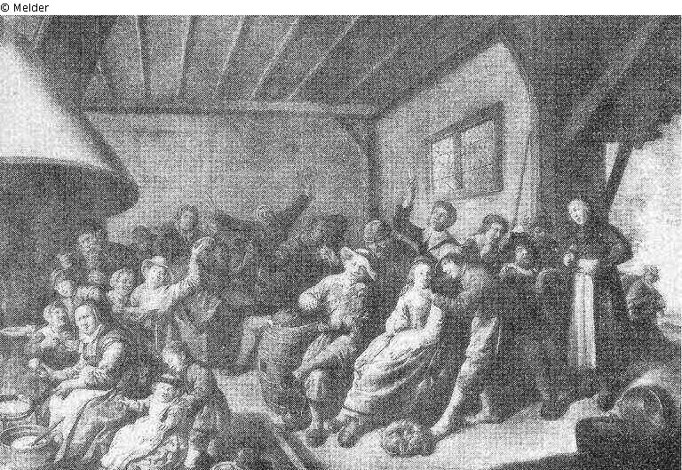 In a tavern with a fireplace to the left and an entrance to the right is a large merrymaking company. In the centre is a fiddler. Near the fireplace is a woman baking cakes, surrounded by children.