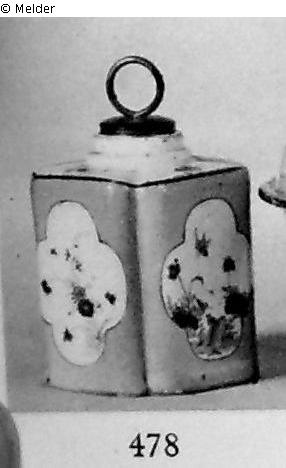 abgerundet, vierkantig, gelber Grund, in Vierpassreserven und auf der Schulter bunte und goldene chinesische Blütenzweige, Fels, Hürde und Vögel, Schwertermarke undeutlich