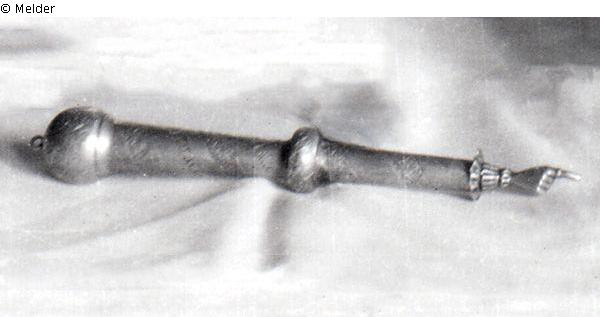 Hand with ring on index finger and large cuff. Stem engraved at the top, sphere with an eyelet, tapering downwards with a ring-like engraved bulge in the middle[,] the whole is engraved with a large band in tendril-like leaves and flowers. In the upper part on a plain surface Hebrew dedication inscription. Silver and maker's mark.